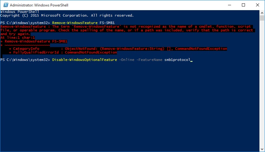 Disable-WindowsOptionalFeature -Online -FeatureName smb1protocol