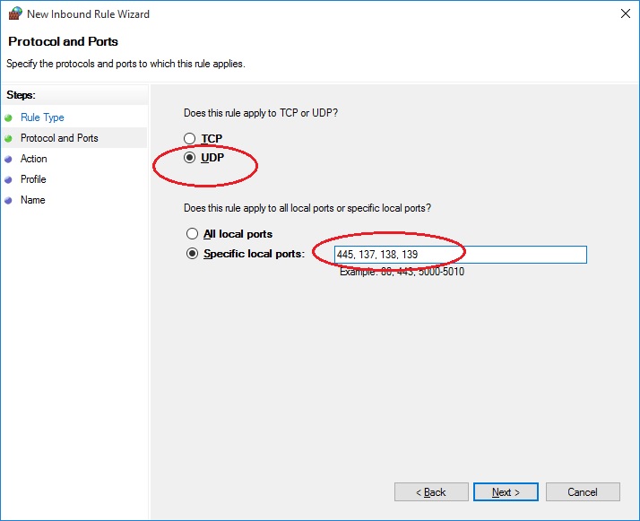 B3: Chọn UDP-> Specific local ports nhập dòng này vào 445, 137, 138, 139