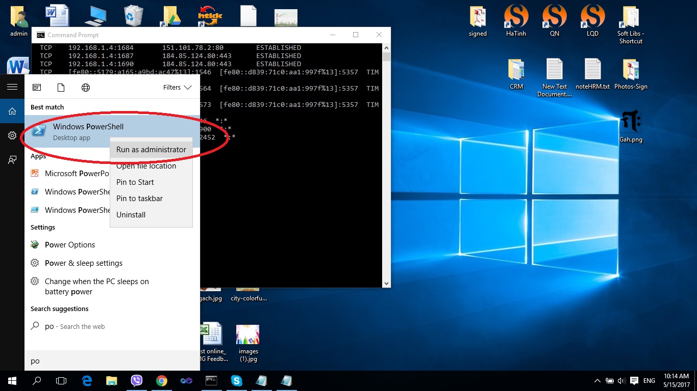 Mở Start-> Windows PowerShell-> Phải chuột vào Windows Powershell chọn Run as administrator